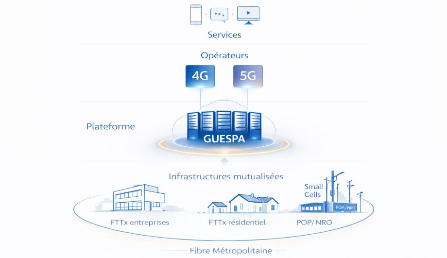 La plateforme d’infrastructures neutre et mutualisée est fondé sur un principe simple : séparer l’infrastructure télécom des services fournis par les opérateurs. GUESPA déploie et exploite un réseau partagé composé de fibre optique, de small cells urbaines, de points de présence (POP / NRO) et d’infrastructures edge, accessibles à plusieurs opérateurs et fournisseurs de services.